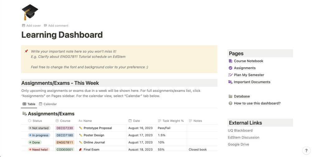 In this template, I use specifically the links used by University of Queensland students, such as Blackboard, EdStem, and Google Drive. But, feel free to adjust and add what's meaningful to yours!